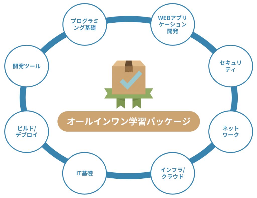 「プログラミング言語の学習」がゴールではなく「プログラミング言語を使ってアプリケーションを開発し、公開できること」を明確なゴール設定とし、そのために必要となるスキル群を網羅的に学習することができます