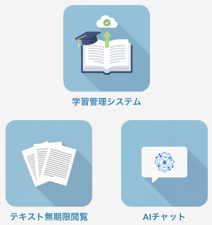 学習管理システム(LMS)による学習進捗の管理、テキスト教材の無期限閲覧、AIチャットサポートなど、初心者が学ぶ際に困ることがないよう、さまざまな学習サポートの仕組みをご用意しています。